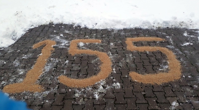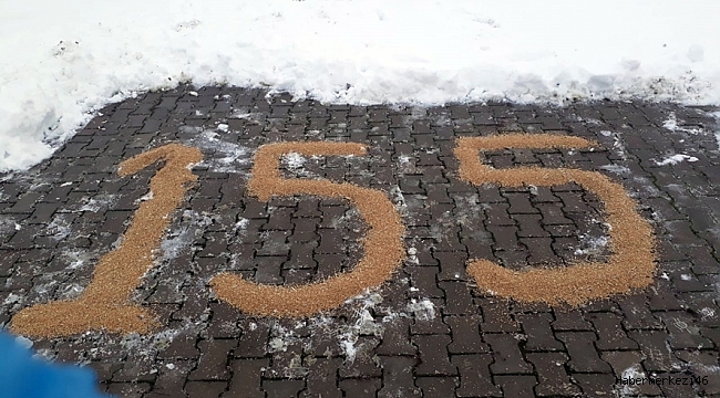 Konağı bahçesinde bulunan Ayyıldız figürünün ortasına kuşlar için yem bırakıldı. Kar yağışının etkili olduğu Afşin’de kuşlar 155 yazı şeklinde