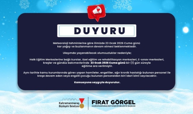 Şehir genelinde etkisini yeniden artıran olumsuz hava koşulları nedeniyle, 23 Ocak Cuma günü eğitim ve kamu hizmetlerine yönelik bir dizi tedbir kararı alındı.