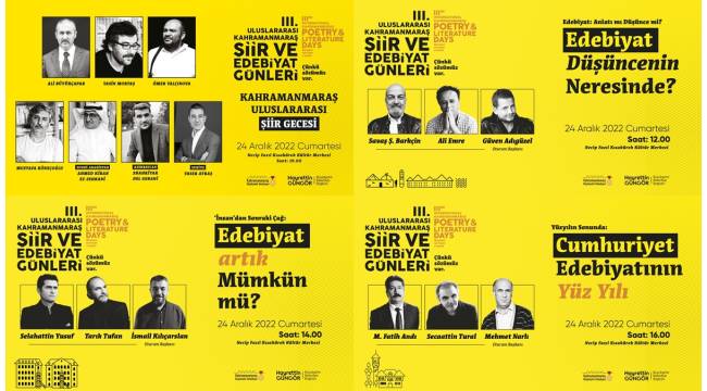 Büyükşehir Belediyesi tarafından düzenlenen 3’üncü Uluslararası Kahramanmaraş Şiir ve Edebiyat Günleri kapsamında 24 Aralık Cumartesi günü çeşitli konferans, şiir dinletisi ve konser etkinlikleri edebiyatseverlerle buluşacak.