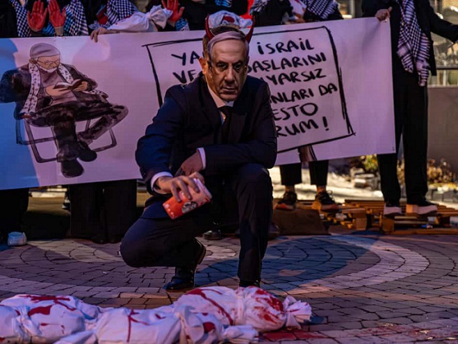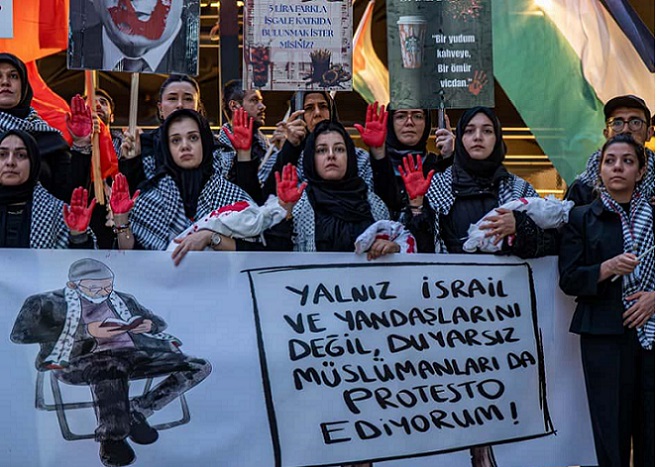 Kahramanmaraş (SHA)- İsrail’in Filistin’de gerçekleştirdiği saldırılara dikkat çekmek isteyen gönüllü vatandaşlar, Kahramanmaraş’ın Binevler bölgesinde bulunan Starbucks önünde 30 gündür sessiz nöbet tutuyor.