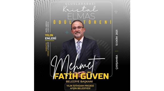 Sunuculuğunu Burcu Esmersoy ve Ceyhun Yılmaz’ın yaptığı Uluslararası Kristal Elmas Ödül Töreni’nde “Yılın İstihdam Projesi Ödülü” kazanan Afşin Belediyesi adına ödülü başkan Mehmet Fatih Güven aldı.