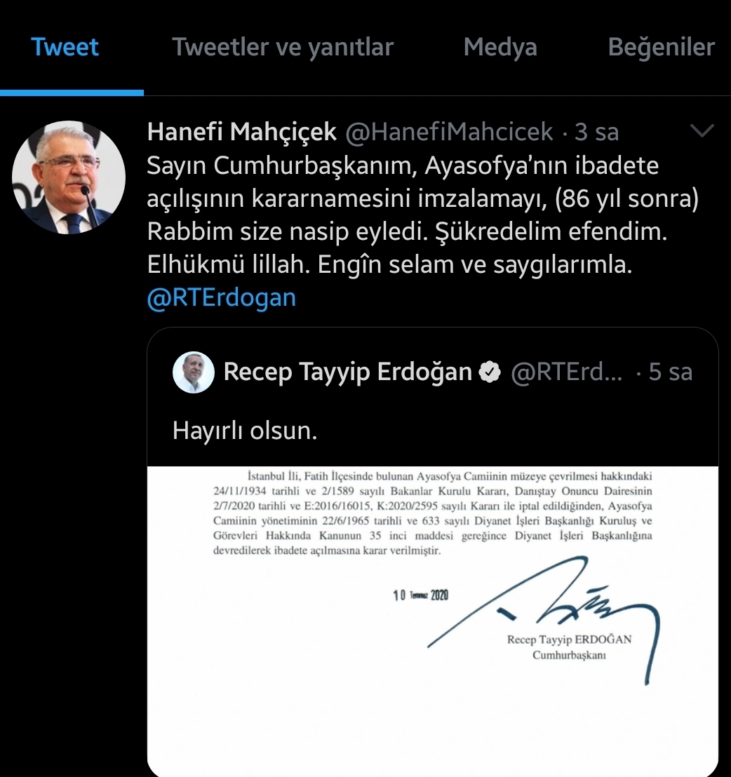 “Danıştayın 10. Dairesi, Ayasofya'nın camiden müzeye dönüştürülmesine dair 24 Kasım 1934 tarihli Bakanlar Kurulu kararını iptali üzerine kararnameyi imzalayan Cumhurbaşkanımız, ilk namazın  24 Temmuz 2020 Cuma günü kılınacağının müjdesini verdi.