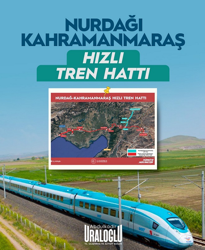 Bakan Uraloğlu, sosyal medya hesabından yaptığı açıklamada, Nurdağı – Kahramanmaraş Hızlı Tren Hattı’nın bölge için stratejik bir ulaşım yatırımı olduğuna dikkat çekerek, “Bu bağlantıyla Kahramanmaraş’ı Doğu Akdeniz limanlarına ve ana ticaret koridorlarına entegre edeceğiz.