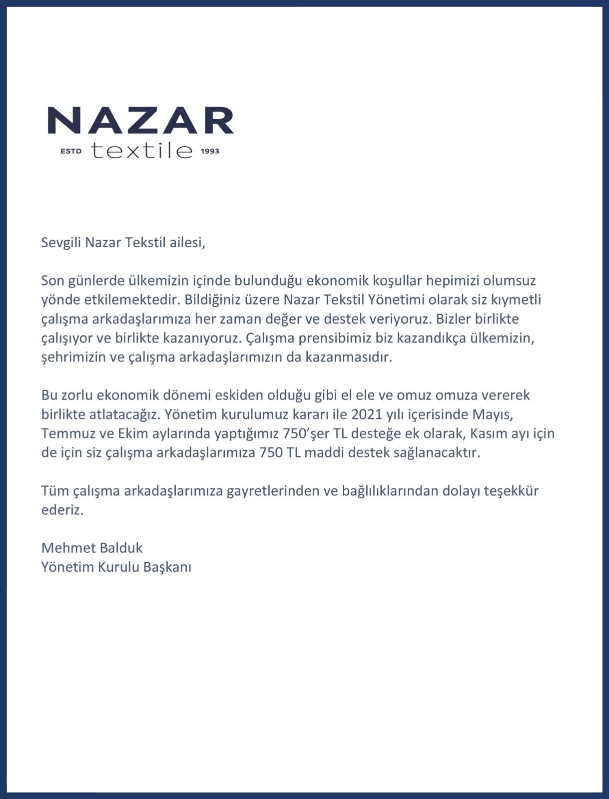 Balduk ailesi Mayıs ayından bu yana çalışanlarına destekle yine öncü ve örnek oldu. Şimdiye kadar Mayıs, Temmuz ve Ekim ayları için kişi başı 750'şer TL maddi destek veren Nazar Tekstil, kişi başı 500 TL ek gıda yardımı ile kişi başı toplamda 2. 750 TL maddi destek vermişti. Çalışanlarına desteğini sürdüren Nazar Tekstil, ek olarak Kasım ayında da kişi başına 750 TL maddi destek vereceğini çalışanlarına duyurdu.