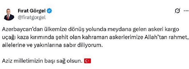 Askeri kargo uçağı kaza kırımında şehit olan kahraman askerlerimize Allah’tan rahmet, ailelerine ve yakınlarına sabır diliyorum. Aziz milletimizin başı sağ olsun” ifadelerini kullandı.