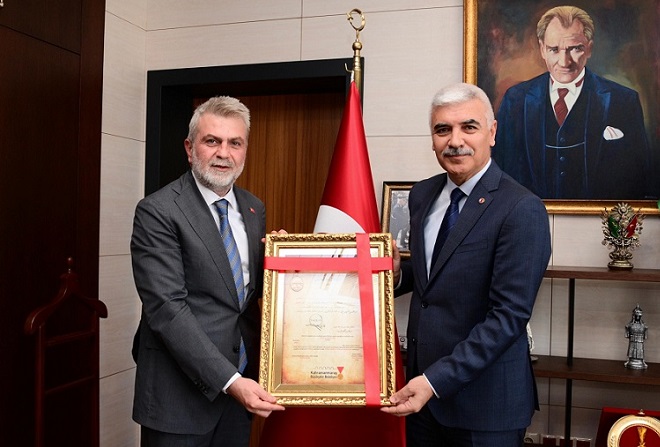 Başkan Görgel, İl Emniyet Müdürü Yiğit’e İstiklal Madalyası ve Beratı tablosu hediye etti.