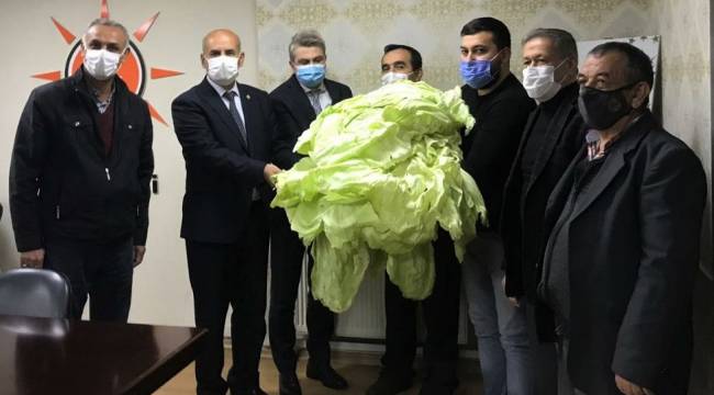 AK Parti İl Başkanı Fırat Görgel’i parti binasında ziyaret eden İğde Sosyal Yardımlaşma Dayanışma Eğitim Kültür Derneği yönetimi, dünyaca büyülüğü ve lezzetiyle ün kazanan ‘Elbistan Lahanası’ hediye etti.