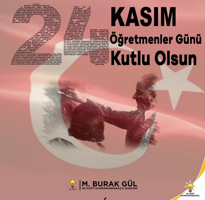 24 Kasım Öğretmenler Günü dolayısıyla mesaj yayımlayan AK Parti Kahramanmaraş İl Başkanı M.Burak Gül, tüm öğretmenlere duyulan saygı ve şükranı güçlü ifadelerle dile getirirken, 6 Şubat depremlerinde hayatını kaybeden öğretmenleri rahmetle andı.