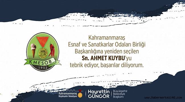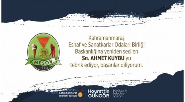 Kahramanmaraş Büyükşehir Belediye Başkanı Hayrettin Güngör, Kahramanmaraş Esnaf ve Sanatkârlar Odası Birliği başkanlığına yeniden seçilen Ahmet Kuybu’yu tebrik etti. Başkan Güngör, “Esnaf ve Sanatkârlar Odası Birliği başkanlığına yeniden seçilen Sayın Ahmet Kuybu’yu tebrik ediyor, başarılar diliyorum” ifadelerini kullandı.