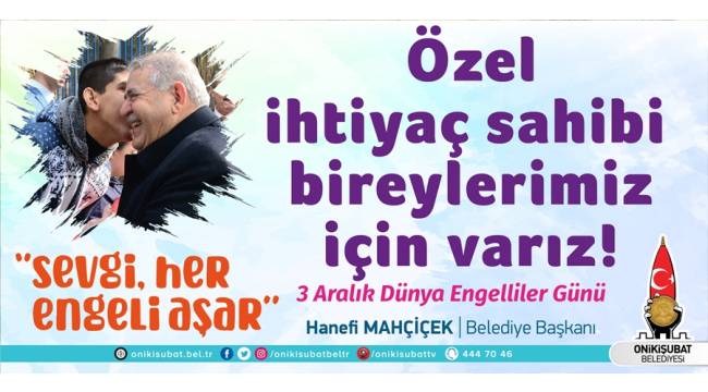 3 Aralık Dünya Engelliler Günü dolayısıyla mesaj yayımlayan Onikişubat Belediye Başkanı Hanefi Mahçiçek, “Özel ihtiyaç sahibi bireylerimiz için varız düşüncesiyle her konuda onların yanında yer almaya, onların hayatlarını kolaylaştırmaya gayret ediyoruz. 3 Aralık Dünya Engelliler Günü’nün, tüm özel ihtiyaç sahibi bireylerimiz için hayırlara vesile olmasını Cenab-ı Hakk’dan diliyorum” dedi.
