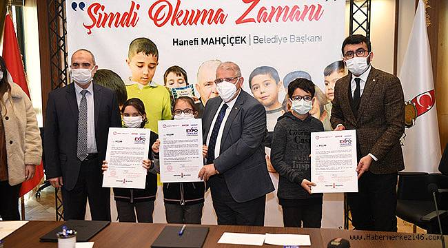 Başkan Mahçiçek ve İlçe Milli Eğitim Müdürü Enver Gökşen atılan imzalar sonrası programa konuk olan 3 öğrencinin program sertifikalarını kendilerine takdim ettiler.