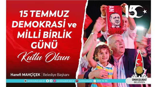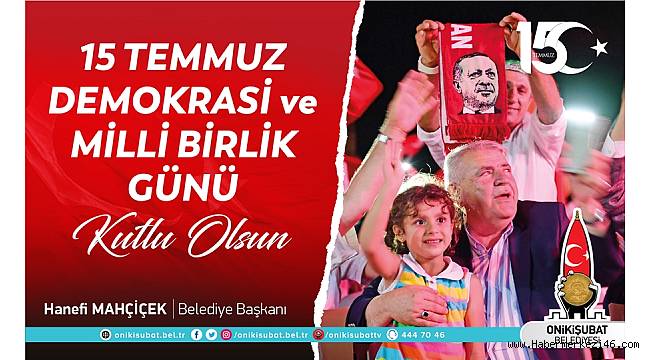15 Temmuz Demokrasi ve Milli Birlik Günü dolayısıyla mesaj yayımlayan Onikişubat Belediye Başkanı Hanefi Mahçiçek, “15 Temmuz 2016 gecesi, Başkomutanımız ve Cumhurbaşkanımız Recep Tayyip Erdoğan’ın riyasetinde, aziz milletimizin ve kahraman güvenlik güçlerimizin onurlu duruşuyla tarihimizin en büyük destanlarından biri olarak hafızalara kazınmıştır. Biz; ‘Türkiye Aşkına’ diyerek dün olduğu gibi bugün de darbecilere ve hainlere geçit vermedik, vermeyeceğiz. Destansı vatan savunmasının yıl dönümünde şehitlerimizi rahmet ve minnetle yâd ediyor, gazilerimize sağlık ve sıhhat diliyorum” dedi.