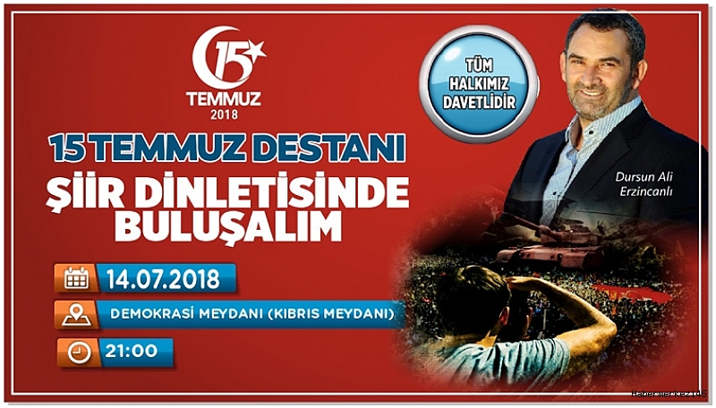 Kahramanmaraş Büyükşehir Belediyesi tarafından düzenlenecek etkinlikler 14 Temmuz 2018 Cumartesi günü saat 21.00’de Demokrasi Meydanı’nda Ali Dursun Erzincanlı’nın şiir dinletisi ile başlayacak.