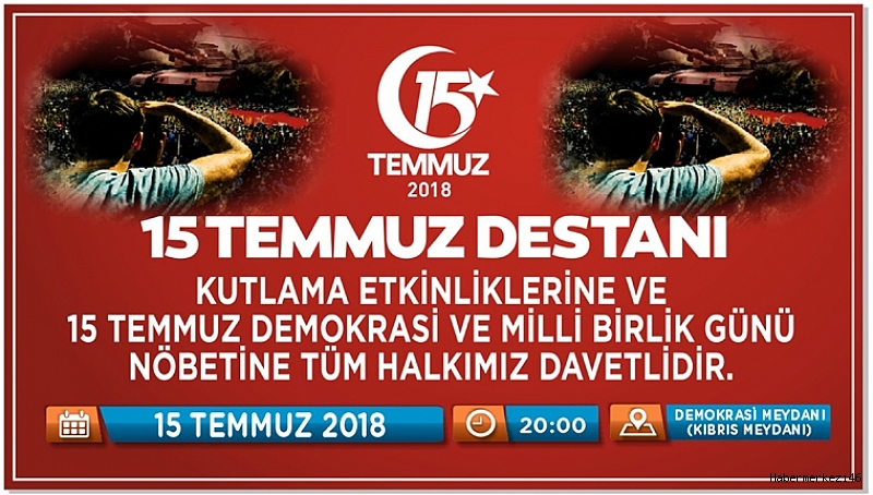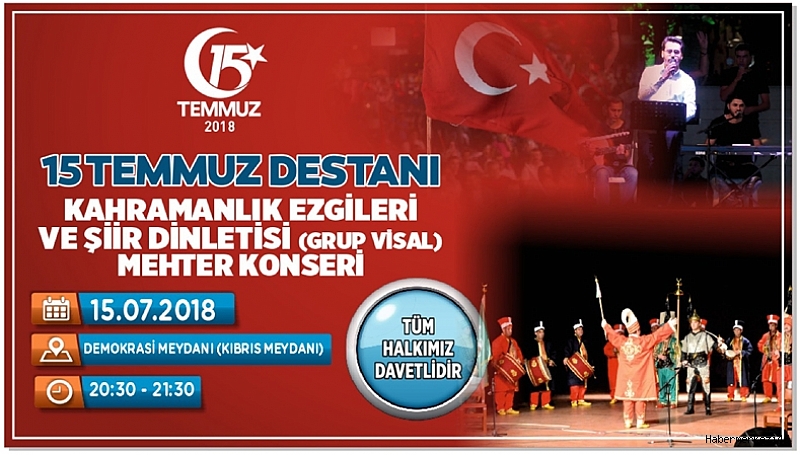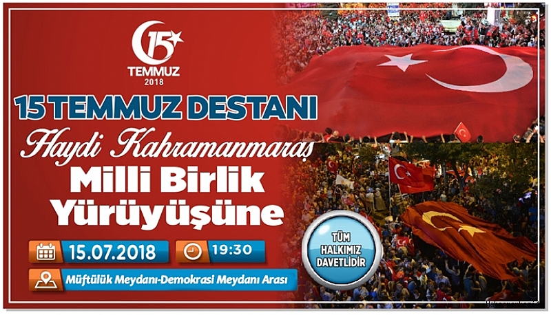 15 Temmuz 2018 Pazar günü akşam saat 20.00’de Demokrasi Meydanı’nda 15 Temmuz Demokrasi ve Milli Birlik Günü Nöbeti başlayacak. Aynı gün saat 20.30-21.30 arasında Grup Visal sahne alarak Kahramanlık Ezgileri ve şiir dinletisi sunacak ve daha sonra Kahramanmaraş Büyükşehir Belediyesi Mehter Takımı tarafından Mehter Konseri sunulacak.