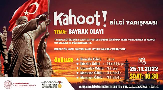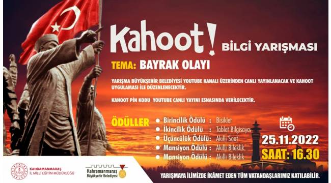 Büyükşehir Belediyesi ve İl Milli Eğitim Müdürlüğü iş birliğiyle 25 Kasım Cuma günü ‘Bayrak Olayı’ temalı Kahoot Bilgi Yarışması düzenlenecek. Kahramanmaraş’ta ikamet eden herkesin katılabileceği yarışmada dereceye girenler çeşitli ödüller de kazanabilecek.