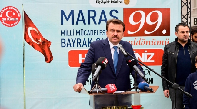 Günün anlam ve önemine ilişkin bir konuşma yapan Kahramanmaraş Büyükşehir Belediye Başkanı Fatih Mehmet Erkoç: “Değerli konuklar bundan tam 99 yıl önce dünyada eşi ve benzerine rastlanmayan bir destan için ilk adımlar atıldı. İşgalci Fransız ordusu bizim özgürlüğümüzün, inançlarımızın, yaşamımızın teminatı olan Ay Yıldızlı Al Bayrağımızı bu burçlardan indirme küstahlığına kalktı. Allah’a hamdolsun o millet, kahraman ecdat ‘O Gün’ ölmediğini, dimdik ayakta olduğunu ve Ay Yıldızlı Al Bayrağın gönderden inmesinin kendisi için ölümden kötü olduğunu tüm dünyaya gösterdi. Ve o gün bu şehrin kanaat önderleri Av. Mehmet Ali Kısakürek Bey bir beyanname yazdı. Ve birazdan bu beyannameyi arkadaşlarımız okuyacak. Ve Rıdvan Hoca bayrağın bizim inancımızda, bizim imanımızda ne anlama geldiğinin dünyada ki en güzel örneğini ortaya koydu. Ay yıldızlı al bayrağın tevhidin bayrağı olduğunu bundan 99 yıl önce tüm dünyaya haykırdı. Ay yıldızlı al bayrak bu burçlarda bin yıldan bu yana dalgalanmaktaydı. Allah’a hamdolsun 99 yıl önce bu gösterilen kahramanlıkla dalgalanmaya devam etmekte. İnşallah kıyamete kadar da ay yıldızlı al bayrağımız bu millet var oldukça dalgalanmaya devam edecek. Bayrağımız dünyada 3 kıtada yüz milyonlarca insanın özgürlüğünün timsaliydi, huzurun timsaliydi. Barışın, kardeşliğin teminatıydı ay yıldızlı al bayrak! Asya’da, Afrika’da, Balkanlar’da insanların gölgesinde özgürce kardeşlik hukuku içinde korkusuzca yaşadığı bir gölgeydi. Son 100 yılda coğrafya değişti, ülkemizin sınırları değişti; Ay yıldızlı al bayrağımızın gölgesinin kalktığı yerlerde bugün acı var, gözyaşı var, kan var, üzüntü var, keder var. Yine hamdolsun ülkemiz saygıdeğer cumhurbaşkanımız Recep Tayyip Erdoğan liderliğinde ayağa kalktı ve bizim gölgelerimizde süzülen ay yıldızlı al bayrak coğrafyaya barış getirdi. Sınırlarımızda gölgesi taşmakta sınır ötesinde de huzurun, kardeşliğin, beraberliğin, birliğin garantisi olmakta hamdolsun. Bugün ay yıldızlı al bayrağın gölgesinde olan yöneticileri tüm dünyada huzur için barış ve kardeşlik için yürümekte. İnşallah bizler de bu şehrin yöneticileri olarak bu şehrin temsilcileri olarak nasıl yüzyıl önce saygıdeğer büyüğümüz Rıdvan Hocamız, Mehmet Ali Kısakürek Beyefendi’nin duruşu ne ise bizler de aynı o şekilde durmaya hep beraberce devam edeceğiz inşallah. Ben 12 Şubat 1920 Kurtuluş Destanını yazan tüm kahramanlarımızı rahmet ve minnetle anıyoruz. Hepsini gönlümüzde, yüreğimizde milletimizin yüreğinde İnşallah kıyamete kadar yaşatacağız ve yaşamakta da! Bayrak olayımız 12 Şubat etkinlikleri içerisinde kutlanmaktaydı. Hamdolsun biz göreve geldik bu çok önemli aslında bizim gönül coğrafyamızda da çok önemli bir anlam ifade eden ‘Özgürlüğün olmadığı yerde Cuma namazı kılmak caiz değildir’ diyen Rıdvan Hocanın sözü çok önemliydi. Mehmet Ali Kısakürek Bey’in ‘aleme İslam’a hitab’ı’ çok önemliydi. Bunlar tarihi manifestolardır. 99 yıl önce tüm dünyaya gösterilen manifestodur bu. Bizim tarihimizde en önemli olan duruşlardan bir tanesidir. İnşallah bizde bu duruşa layık olacağız. Bizde bu kahramanların emanetini hep başımızın, omzumuzun üzerinde taşımaya devam edeceğiz inşallah. Onların emanetini en iyi şekilde, en güzel, en yaşanabilir hale getirmek için gayret ettik, etmeye de hep beraberce devam edeceğiz. Ben tüm kahramanlarımızı Kurtuluş Savaşında şahadete yürüyen tüm kahramanlarımızı, ebediyete intikal etmiş tüm gazilerimizi bugünde sınır boylarında bu vatanın bekası için gözünü kırpmadan şahadete yürüyen şehitlerimizi de gazilerimizi de minnetle anıyorum. Şehitlerimizin ruhu şad olsun inşallah. Hepinizi saygıyla selamlıyor, hepinizi Allah’a emanet ediyorum”dedi.