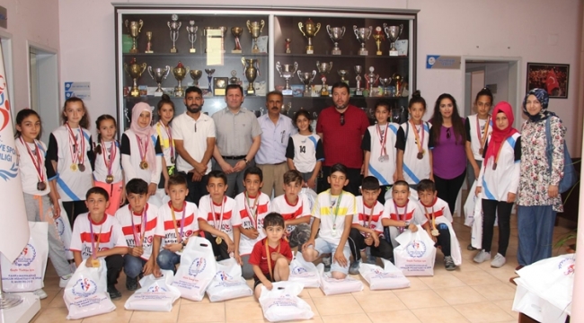 antrenör ve idarecileri tebrik etti. Sporculara spor malzemesi hediye eden