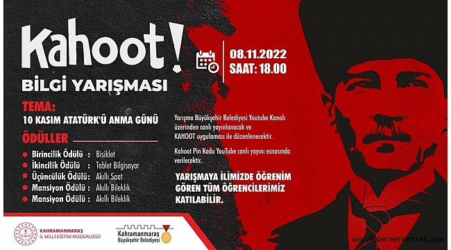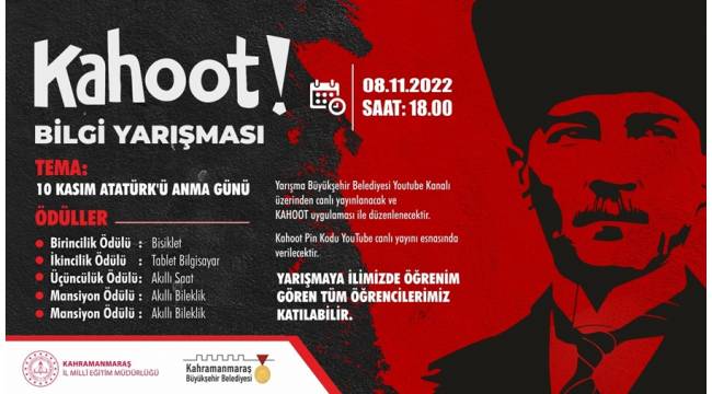 Büyükşehir Belediyesi ve İl Milli Eğitim Müdürlüğü iş birliğiyle 8 Kasım Salı günü “10 Kasım Atatürk’ü Anma Günü” temalı Kahoot Bilgi Yarışması düzenlenecek. Saat 18.00’da başlayacak bilgi yarışmasına Kahramanmaraş’ta öğrenim gören tüm öğrenciler katılabilecek.