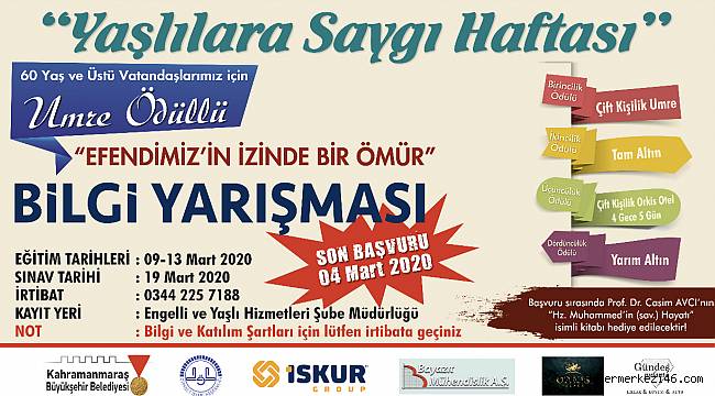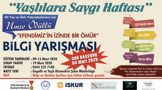 Kahramanmaraş Büyükşehir Belediyesi’nin Yaşlılara Saygı Haftası dolayısıyla gerçekleştireceği “Efendimiz’in İzinde Bir Ömür” konulu bilgi yarışmasının tarihleri belli oldu. Yarışmaya yalnızca 60 yaş ve üstündeki kişiler katılabilmektedir. Yarışma için önce 09-13 Mart 2020 tarihleri arasında eğitim verilecektir. Eğitimden sonra, 19 Mart 2020 tarihinde sınav yapılacaktır. Eğitime katılmak isteyenler için son başvuru tarihi ise, 04 Mart 2020’dir. Birincilik ödülü, çift kişilik umre; ikincilik ödülü, tam altın; üçüncülük ödülü, Orkis Otel’de 4 gece 5 gün çift kişilik tatil; dördüncülük ödülü yarım altın olan “Efendimiz’in İzinde Bir Ömür” Bilgi Yarışmasına başvurular, Kahramanmaraş büyükşehir belediyesi Engelli ve Yaşlı Hizmetleri Şube Müdürlüğüne yapılacaktır. Yarışma şartlarıyla ilgili ayrıntılı bilgi almak isteyenler için irtibat numarası: 0344 225 7188. Ayrıca başvuruda bulunan herkese Prof. Dr. Casim Avcı’nın “Hz. Muhammed’in (sav.) Hayatı” isimli kitabı hediye edilecektir.