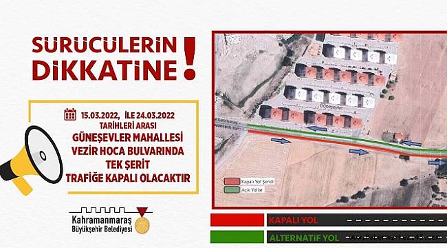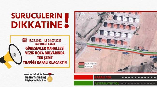 Bu kapsamda, Ulaşım Hizmetleri Dairesi Başkanlığı tarafından alınan karar doğrultusunda Vezir Hoca Bulvarı’nın tek şeridi 15 - 24 Mart tarihleri arasında trafiğe kapalı olacak.