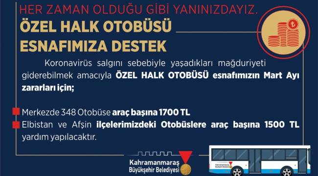 Koronavirüs salgını sebebiyle yaşadıkları mağduriyeti gidermek amacıyla özel halk otobüsü esnafına Mart ayı zararları için; merkezde bulunan 348 otobüse araç başına 1700 TL, Elbistan ve Afşin ilçelerimizdeki otobüslere araç başına ise 1500 TL yardım yapılacak.