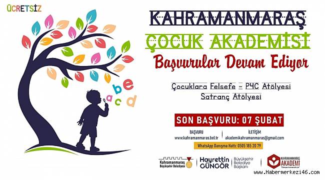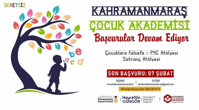 Akademide, 8-10 yaş arası çocuklar Çocuklarla Felsefe - P4C Atölyesi, 7-12 yaş arası çocuklar ise Satranç Atölyesi’ne başvuru yapabilecek. Büyükşehir Belediyesi’nin internet sitesi üzerinden çevrimiçi olarak yapılan ön kayıtlarda son gün 7 Şubat Salı. Kahramanmaraş Çocuk Akademisi başvuru formuna ve atölyelere ilişkin detaylı bilgiye https://kahramanmaras.bel.tr/duyuru/2023/01/21/kahramanmaras-cocuk-akademisi-basvuru-formu internet adresi üzerinden ulaşılabiliyor.