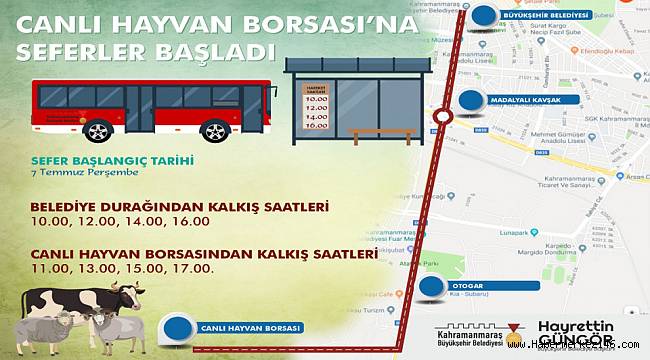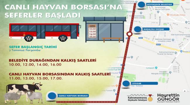 Kahramanmaraş Büyükşehir Belediyesi, yaklaşan Kurban Bayramı öncesi kurbanlık alacak vatandaşların Canlı Hayvan Borsası’na ulaşım sağlayabilmesi için ücretsiz ring seferleri başlatıyor. Büyükşehir Belediyesi’nin karşısındaki duraktan Canlı Hayvan Borsası’na ulaşım sağlayacak seferler 7 Temmuz Perşembe gününden itibaren hizmet vermeye başlayacak. Büyükşehir Belediyesi’nin karşısındaki duraktan saat 10.00 – 12.00 – 14.00 ve 16.00’da hareket edecek otobüsler; Canlı Hayvan Borsası’ndan 11.00 – 13.00 – 15.00 ve 17.00 saatlerinde geri dönüş yapacak.