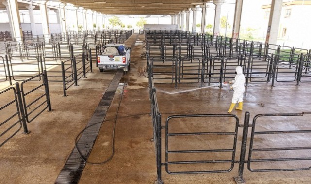 Hem hayvanların hem de alanda hizmet alan vatandaşların sağlığını korumayı hedefleyen ekipler, pazar alanının tüm ortak kullanım noktalarında titiz bir çalışma yürüttü.