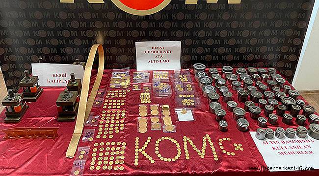 Alınan bilgilere göre, İl Emniyet Müdürlüğü KOM Şube Müdürlüğü ekipleri, Hazine ve Maliye Bakanlığı Darphanesinde ile Damga Matbaası Genel Müdürlüğünde basılması gereken çeyrek, yarım, tam ve cumhuriyet altını basımı yaptığı bilgisiyle harekete geçti. İşyerleri ve 2 araçta yapılan aramalarda, basıma hazır halde toplamda 30 adet işlenmemiş altın pulu, basılmış 286 adet çeyrek, yarım, tam cumhuriyet altını ve reşat altın, basım için hazırlanan yassı kemer şeklinde 3 parça halinde altın, basım ve mühürlemede kullanılan toplamda 33 adet mühür ve Atatürk baskısı olan araç (yaklaşık değeri 300 bin TL), 2 adet pres makinesiyle yaklaşık 700 bin TL değerinde toplamda 1 kilo 710 gram altın ele geçirdi. İşyerinde şüpheli 2 şüpheli M.D ile E.D hakkında paraya eşit değerde sahtecilik kanunu kapsamında yasal işlem başlatıldı.