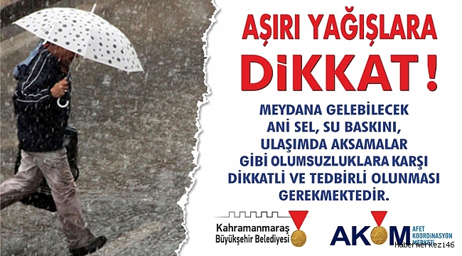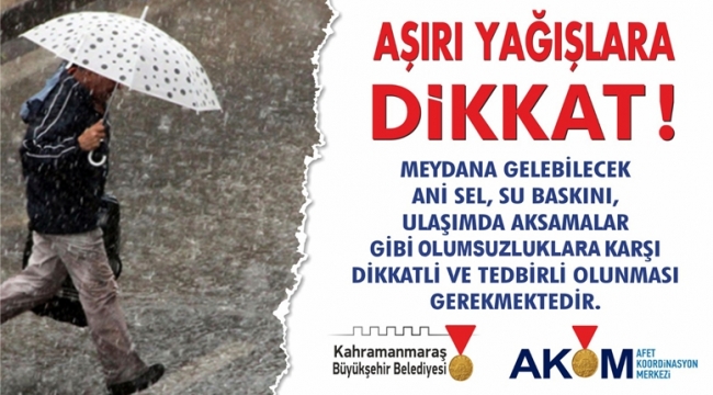 AKOM’dan yapılan açıklamada: “İlimizde meydana gelebilecek ani sel, su baskını, ulaşımda aksamalar gibi olumsuzluklara karşı dikkatli ve tedbirli olunması gerekmektedir. Meteoroloji kaynaklarından edinilen bilgilere göre bu geceden başlamak üzere Çarşamba gününe kadar Kahramanmaraş genelinde sağanak yağış olacağı tahmin edildiğinden, vatandaşlarımızın bu konuda duyarlı olmaları gerekmektedir.