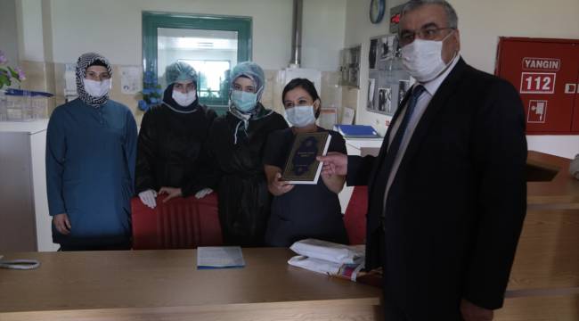 Sürgeç, Başhekim Şirikçi'ye sağlık çalışanlarına verilmek üzere Kur'an-ı Kerim ve aile hayatını anlatan kitaplar hediye etti.