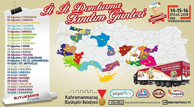 2. Uluslararası Kahramanmaraş Dondurma ve Kültür Sanat Festivali’nin tanıtımı için bu yıl ülke genelinde ve Kuzey Kıbrıs Türk Cumhuriyeti’nde 27 noktada hizmet verecek olan dondurma tırı 2 Ağustos 2018 Perşembe günü saat 12.00-14.00 arasında Osmaniye’de Cumhuriyet Meydanı’nda Osmaniyeliler ile buluşacak.