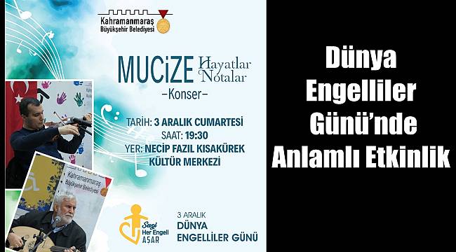 Sosyal belediyecilik hizmetleri çerçevesinde her zaman özel gereksinimli bireylerin yanında olan, desteklerini hiçbir zaman eksik etmeyen Kahramanmaraş Büyükşehir Belediyesi, 3 Aralık Dünya Engelliler Günü’nde ‘Mucize Hayatlar – Notalar’ temalı konser etkinliği düzenleyecek.