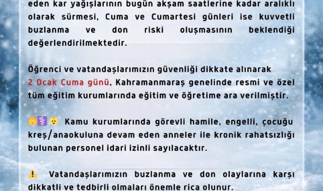 Öğrenciler ile vatandaşların güvenliğinin ön planda tutulduğu vurgulanan açıklamada, 2 Ocak Cuma günü Kahramanmaraş genelinde resmi ve özel tüm eğitim kurumlarında eğitim ve öğretime 1 gün süreyle ara verildiği ifade edildi.
