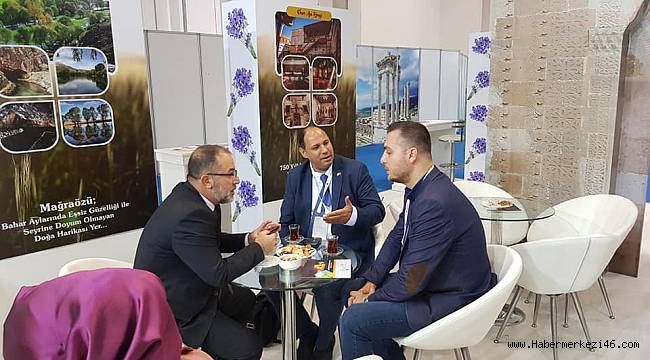 katıldı. Afşin Belediyesi olarak geniş bir stantta başta Eshab-ı Kehf olmak üzere ilçemizin tarihi ve kültürel özelliklerini katılımcılara tanıttık. Her fuarda olduğu gibi Afşin’imizin incisi Eshab-ı Kehf ilgi odağı oldu. Yerli ve yabancı tur operatörleri, ajanslar ile görüşmelerimizi gerçekleştirdik. İnşallah bunların meyvelerini toplayacağız. Afşin olarak turizm pastasından payımızı almak istiyoruz.” Açıklamasında bulundu.