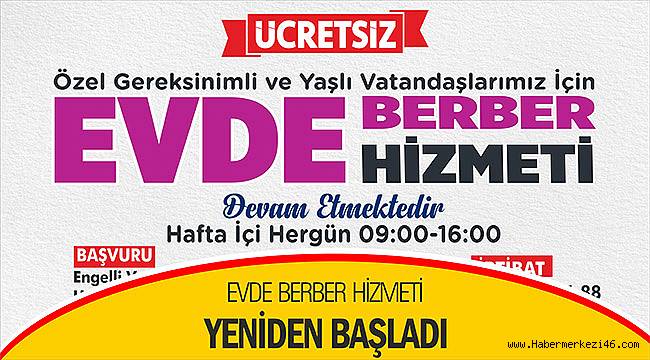 Her gün 09.00-16.00 saatleri arasında verilen Evde Berber hizmetinden faydalanmak isteyen özel gereksinimli bireyler ve yaşlı vatandaşlar Engelli ve Yaşlı Hizmetleri Şube Müdürlüğüne müracaat ederek veya 0344 225 71 88 numaralı telefondan irtibat kurabilirler.