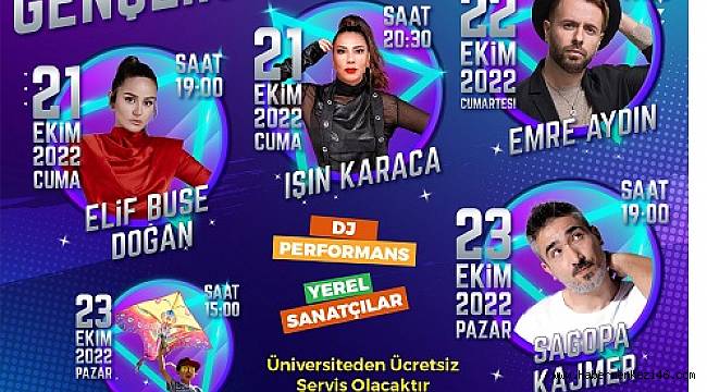 Hem gençlerin sosyalleşmesini sağlamak hem de EXPO 2023 Rekreasyon Alanı ile gençleri buluşturmayı hedefleyen Gençlik Festivali’nde birbirinden önemli sahne performansları sergilenecek. Festivalin ilk günü olan 21 Ekim’de, muhteşem yorum ve güçlü sesleriyle saat 19.00’da Elif Buse Doğan, saat 20.30’da ise işın karaca sahne alacak.