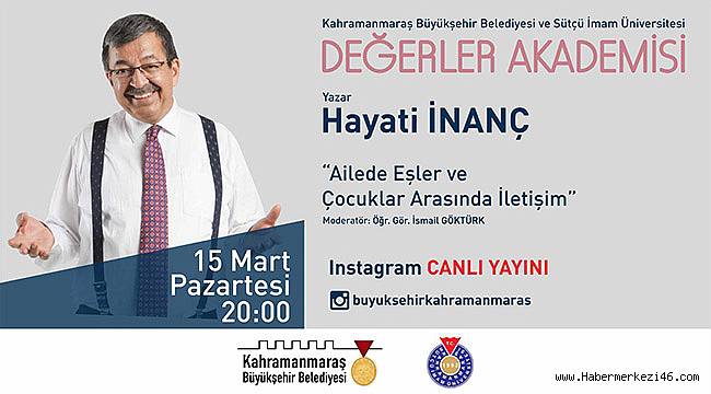 Kahramanmaraş Büyükşehir Belediyesi ve Kahramanmaraş Sütçü İmam Üniversitesi iş birliği ile gerçekleştirilecek Değerler Akademisi, 15 Mart Pazartesi günü başlıyor. Saat 20.00’da, Büyükşehir Belediyesi instagram hesabından canlı yayınlanacak programda Hayati İnanç, ‘Ailede Eşler ve Çocuklar Arasında İletişim’ üzerine konuşacak. KSÜ Öğretim Görevlisi İsmail Göktürk moderatörlüğünde gerçekleştirilecek çevrimiçi etkinlik ile ilgili olarak Sağlık ve Sosyal Hizmetler Dairesi Başkanlığı tarafından yapılan açıklamada, “KSÜ işbirliği ile gerçekleştirdiğimiz Değerler Akademisi’nde takvimi Yazar Hayati İnanç ile başlatıyoruz. 15 Mart Pazartesi 20.00’da gerçekleştirilecek etkinlik Büyükşehir Belediyesi instagram hesabından canlı yayınlanacak. Moderatörlüğünü KSÜ Öğr. Gör. İsmail Göktürk’ün yapacağı programda ‘Ailede Eşler ve Çocuklar Arasında İletişim’ konuşulacak. Tüm hemşehrilerimizi çevrimiçi gerçekleştireceğimiz bu etkinliğimize davet ediyoruz” ifadeleri kullanıldı.