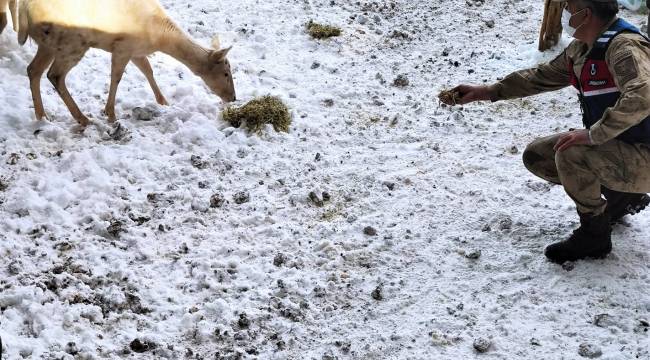 Saman balyalarını fark etmeleriyle görevlilerin yanlarına kalan geyikleri jandarma ekipleri, zaman zaman eliyle besledi.