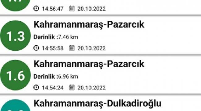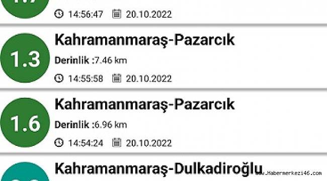 Afet ve Acil Durum Yönetimi Başkanlığı Deprem Dairesi Başkanlığı (AFAD) verilerine göre, bugün Pazarcık ve Dulkadiroğlu ilçelerinde 14.34 ile 15.05 saatleri arasında en büyüğü 4.5, en küçüğü 1.3 olmak üzere 6 kez sallandı.