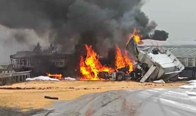 Kahramanmaraş (SHA)- Kahramanmaraş-Gaziantep yolu üzerinde meydana gelen zincirleme trafik kazasında hububat yüklü 3 tır çarpıştı, çarpışmanın ardından araçlarda yangın çıktı.