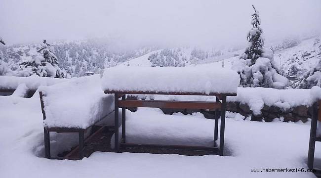 Toros kıvrım dağlarının bir parçası olan dağ, mevsimin ilk kar yağışıyla beyaza büründü, zirvede ve eteklerindeki yerleşkede kartpostallık manzaralar oluşturdu.