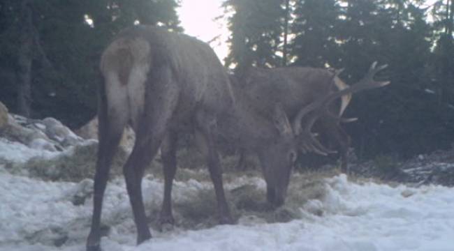 Doğa Koruma ve Milli Parklar Genel Müdürlüğü tarafından korunan, gözetim altında tutulan kızıl geyiklerin, karlı dağlarda sarp alanlara bırakılan yemleri yedikleri, foto kapanlar tarafından görüntülendi.