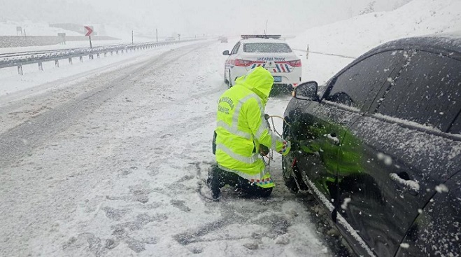 Jandarma trafik ekipleri, sürücülere kış lastiği kullanımı ve araçlarda bulundurulması gereken zincir ile diğer kış ekipmanları konusunda uyarılarda bulundu. Alınmayan önlemlerin ciddi riskler doğurabileceğine dikkat çeken ekipler, sürücülerin daha dikkatli ve tedbirli olmalarını istedi.
