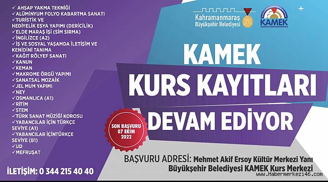 Kahramanmaraş büyükşehir belediyesi tarafından düzenlenen Meslek Edindirme ve Sanat Eğitimi Kursları’nda (KAMEK) yeni dönemde kursiyerlere verilecek olan Ahşap Yakma, Turistik ve Hediyelik Eşya Yapımı, İngilizce, Kanun, Keman, Ney, Osmanlıca, Ritim, Stem ve Mefruşat başta olmak üzere toplamda 21 atölyede başvurular devam ediyor. Mehmet Akif Ersoy Kültür Merkezi’nin yanında bulunan Büyükşehir Belediyesi KAMEK Kurs Merkezi’nde gerçekleştirilecek eğitimlere 7 Ekim Cuma günü mesai bitimine kadar yine aynı noktadan başvuru yapılabilecek. Büyükşehir Belediyesi’nden yapılan açıklamada, kurslarla ilgili detaylı bilgiye 0344 215 40 40 numaralı telefondan ulaşılabileceği belirtildi.