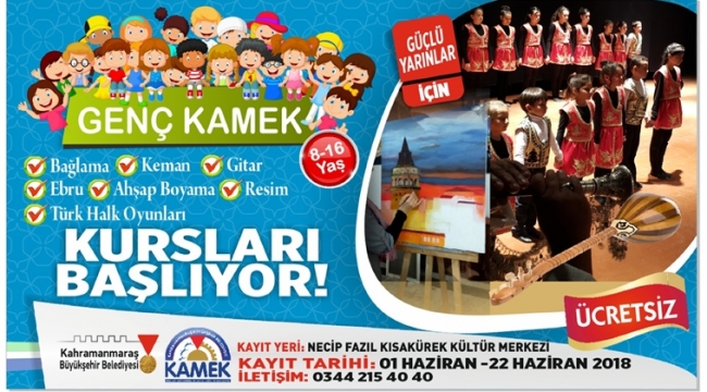 Kahramanmaraş Büyükşehir Belediyesi bünyesinde Necip Fazıl Kısakürek Kurs Merkezi ile Özel İdare Kurs Merkezinde hizmet veren KAMEK kurslarının yaz dönemi kayıtları 1 Haziran 2018 tarihinde başladı ve 22 Haziran 2018 Cuma gününe kadar devam edecek.