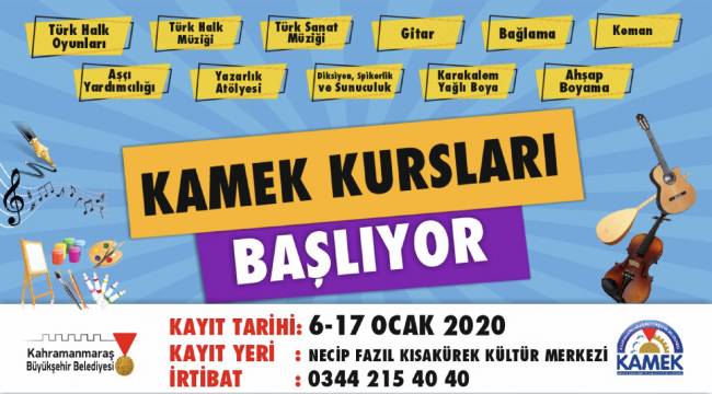 KAMEK Kursları bünyesinde Necip Fazıl Kısakürek Kurs Merkezi’nde; Türk Halk Oyunları, Türk Halk Müziği, Türk Sanat Müziği, Gitar, Bağlama, Keman, Aşçı Yardımcılığı, Yazarlık Atölyesi, Diksiyon, Spikerlik ve Sunuculuk, Karakalem Yağlı Boya ve Ahşap Boyama dallarında kurs verilecek.
