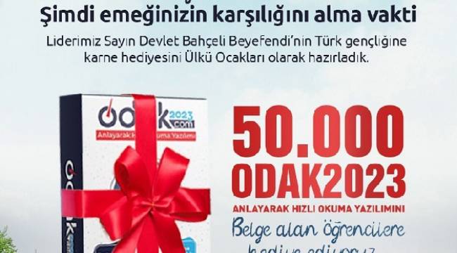 Ülkü Ocakları Genel Başkanı Ahmet Yiğit Yıldırım, yarıyıl tatilinde takdir ve teşekkür alan öğrencilere müjde verdi. Yıldırım, öğrencilere karne hediyesi olarak yapay zekâ teknolojisiyle hazırlanan Anlayarak Hızlı Okuma Yazılımı Odak2023’ü hediye edeceklerini duyurdu.