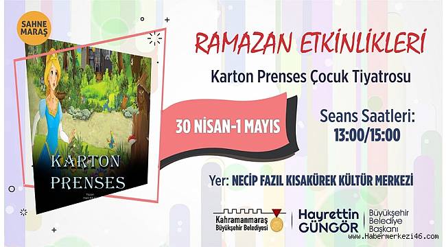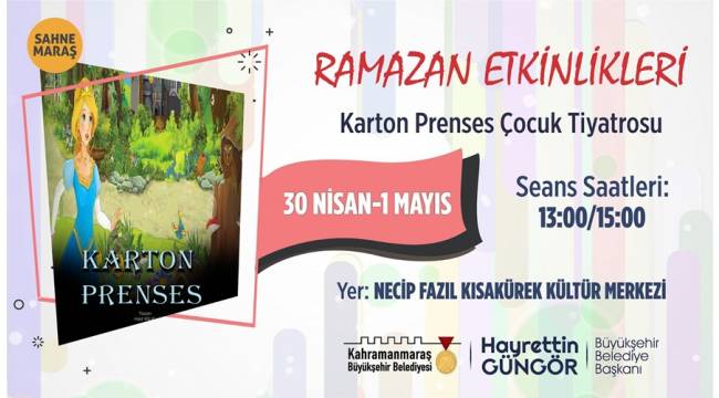 Kahramanmaraş Büyükşehir Belediyesi, Ramazan etkinlikleri kapsamında birbirinden renkli ve eğlenceli programlar düzenlemeye devam ediyor. Etkinlikler kapsamında, 30 nisan cumartesi ve 1 mayıs pazar günleri Sahne Maraş Tiyatro Okulu öğrencileri ‘Karton Prenses’ adlı tiyatro gösterisini minikler için sahneleyecek. Necip Fazıl Kısakürek Kültür Merkezi’nde sahnelenecek oyun saat 13.00 ve 15.00’te iki seans şeklinde gerçekleştirilecek.