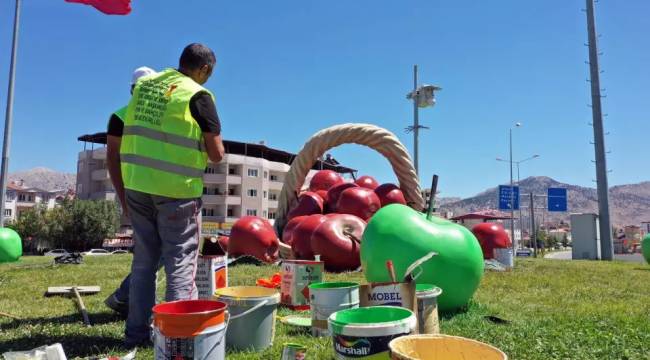 Göksun İlçesi ile özdeşleşen elma figürlerinin yer aldığı kavşakta bakım ve onarım çalışmaları yapan ekipler, çalışmalara refüj, kavşak ve meydanlarda devam ediyor.